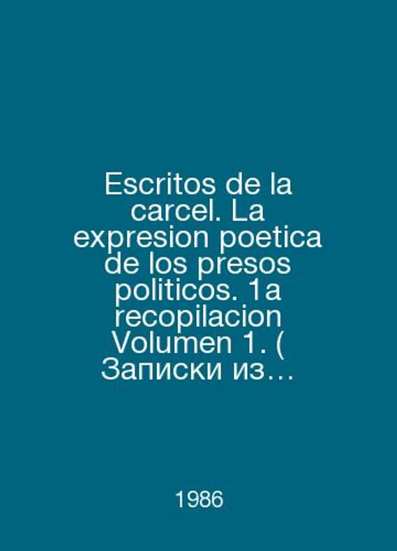 Escritos de la carcel. La expression of poetry de los presos politicos. 1a recopilacion Volumen 1. (Notes from prison. Poetic expression of political prisoners. Volume 1) In Russian /Escritos de la carcel. La expresion poetica de los presos politicos. 1a recopilacion Volumen 1. ( Zapiski iz tyurmy. Poeticheskoe vyrazhenie politicheskikh zaklyuchennykh. 1-y sbornik Tom 1 ) In Spanish. C.I.C. Centro Integracion Cultural. 1986.Contact us for details or to request photos of available books. Delivery of this book could take longer than normal due to additional handling time before shipping, and no rush delivery options are available. Please let us know if you have a specific date by which you need to receive your order.SKUalb1b12e1edc282343a