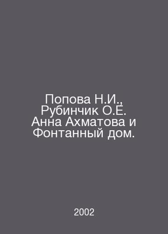 N.I. Popova, O.E. Rubinchik Anna Akhmatova and the Fountain House. In Russian /Popova N.I., Rubinchik O.E. Anna Akhmatova i Fontannyy Dom.Publication of Anna Akhmatova Museum in Fountain House. St. Petersburg. Nevsky Dialect. 2009.We have thousands of titles and often several copies of each title may be available. Please feel free to contact us for a detailed description of the copies available. SKUalb87246c2f39c8d82d.