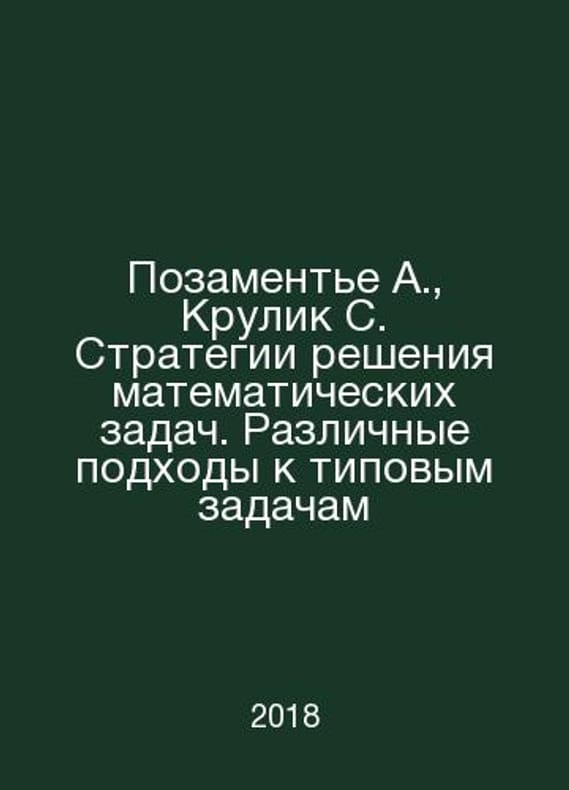 Substitution of A., Krulik S. Strategies for solving mathematical problems. Different approaches to typical problems In Russian /Pozamente A., Krulik S. Strategii resheniya matematicheskikh zadach. Razlichnye podkhody k tipovym zadacham M.: Alpina Publisher 2018.Contact us for details or to request photos of available books. Delivery of this book could take longer than normal due to additional handling time before shipping, and no rush delivery options are available. Please let us know if you have a specific date by which you need to receive your order.SKUalb1dbe55453afc228f