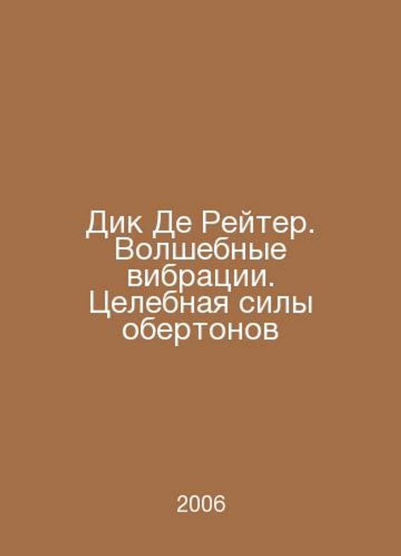 Dick De Reuter. Magical Vibrations. The Healing Powers of the Overtons In Russian /Dik De Reyter. Volshebnye vibratsii. Tselebnaya sily obertonov Open World Moscow 2006. Contact us for details or to request photos of available books. Delivery of this book could take longer than normal due to additional handling time before shipping, and no rush delivery options are available. Please let us know if you have a specific date by which you need to receive your order. SKUalb1dde3bc6b1345143