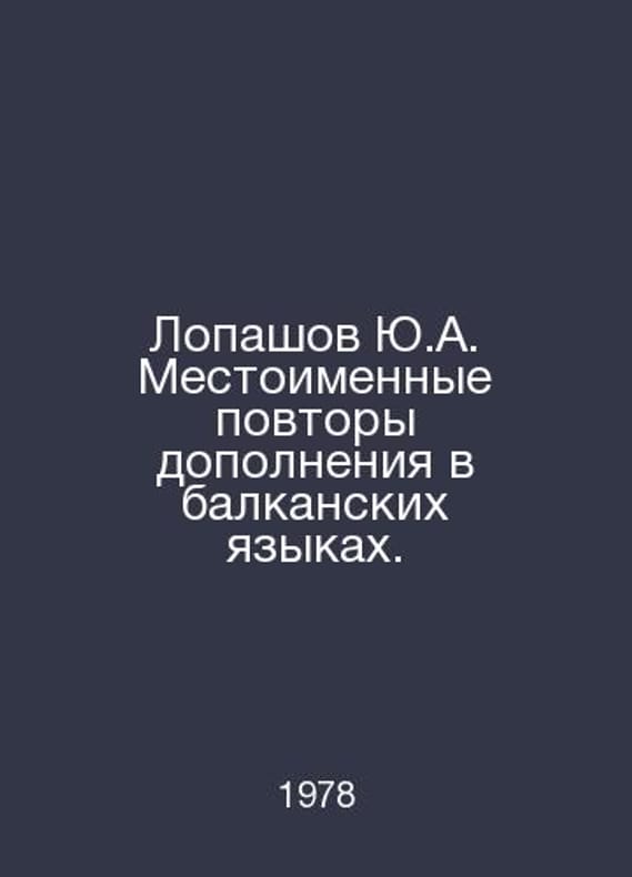 Lopashov Yu.A. pronoun repetitions of the supplement in Balkan languages. In Russian /Lopashov Yu.A. Mestoimennye povtory dopolneniya v balkanskikh yazykakh. Academy of Sciences of the USSR. Institute of Linguistics. L. Science. 1978.. Contact us for details or to request photos of available books. SKUalb1e84553299101eab.
