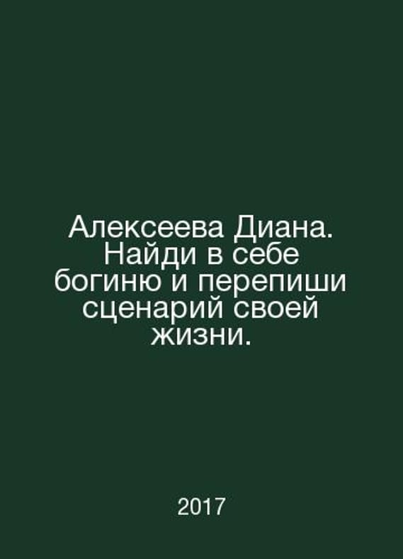 Alexeyeva Diana. Find a goddess in yourself and rewrite the script of your life. In Russian /Alekseeva Diana. Naydi v sebe boginyu i perepishi stsenariy svoey zhizni. Sat.: All 2017. Contact us for details or to request photos of available books. Delivery of this book could take longer than normal due to additional handling time before shipping, and no rush delivery options are available. Please let us know if you have a specific date by which you need to receive your order. SKUalb1ea1853ee3f36a1b