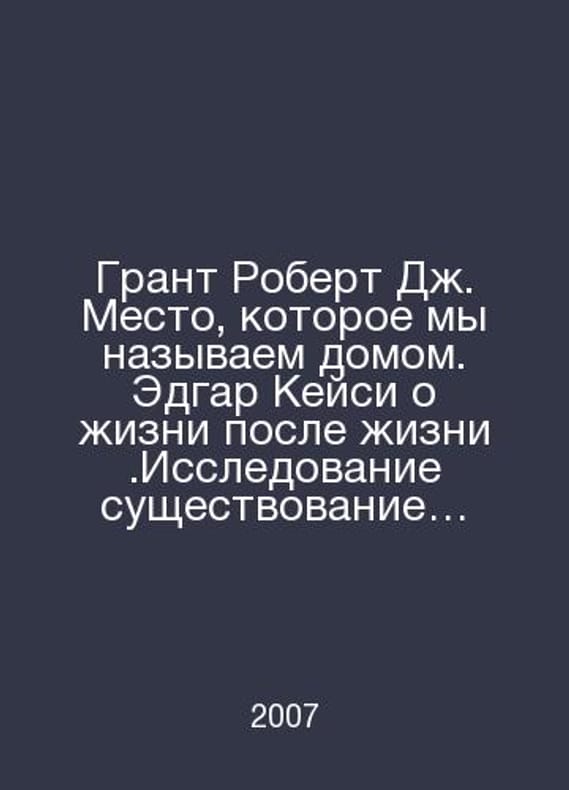 Robert J. Grant The Place We Call Home. Edgar Casey on Life After Life. Exploring the Existence of Soul After Death. In Russian /Grant Robert Dzh. Mesto, kotoroe my nazyvaem domom. Edgar Keysi o zhizni posle zhizni.Issledovanie sushchestvovanie dushi posle smerti. Series: Travels of the Soul. The Future of the Earth. 2007. Contact us for details or to request photos of available books. Delivery of this book could take longer than normal due to additional handling time before shipping, and no rush delivery options are available. Please let us know if you have a specific date by which you need to receive your order. SKUalb2035f0aa92977a59