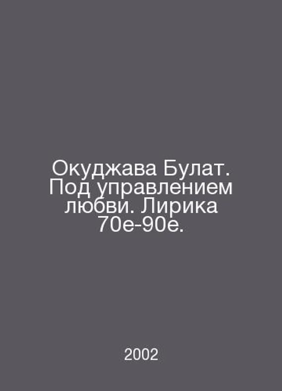 Okudzhava Bulat. Conducted by Love. Lyrics from the 1970s-1990s. In Russian /Okudzhava Bulat. Pod upravleniem lyubvi. Lirika 70e-90e. Compiled by Bulkov L. Editor Semukhina S. Ekaterinburg. U-Factor. 2002.Contact us for details or to request photos of available books. Delivery of this book could take longer than normal due to additional handling time before shipping, and no rush delivery options are available. Please let us know if you have a specific date by which you need to receive your order.SKUalb206bb864d33dd268