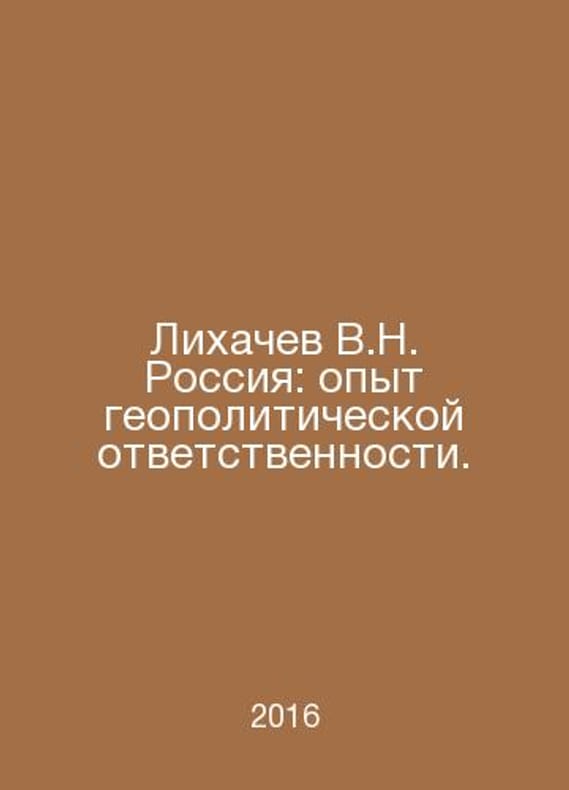 V.N. Likhachev Russia: Experience of Geopolitical Responsibility. In Russian /Likhachev V.N. Rossiya: opyt geopoliticheskoy otvetstvennosti. M edit Rossiyskaya Gazeta 2016.Contact us for details or to request photos of available books. Delivery of this book could take longer than normal due to additional handling time before shipping, and no rush delivery options are available. Please let us know if you have a specific date by which you need to receive your order.SKUalb21660816da3246fc