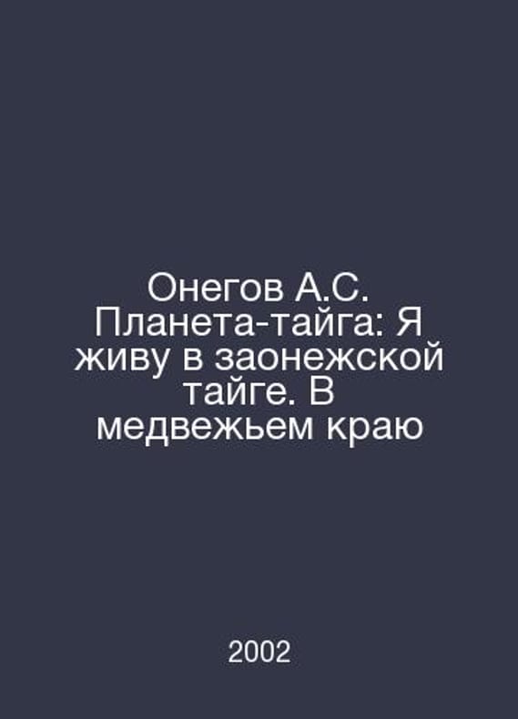 A.S. Onegov The taiga planet: I live in the Zaonezh taiga. In the bear land In Russian /Onegov A.S. Planeta-tayga: Ya zhivu v zaonezhskoy tayge. V medvezhem krayu Nature Stories. Hud. B. Chupygin. Green series M Armada-press 2002.Contact us for details or to request photos of available books. Delivery of this book could take longer than normal due to additional handling time before shipping, and no rush delivery options are available. Please let us know if you have a specific date by which you need to receive your order.SKUalb21e5d8c6a7b94712
