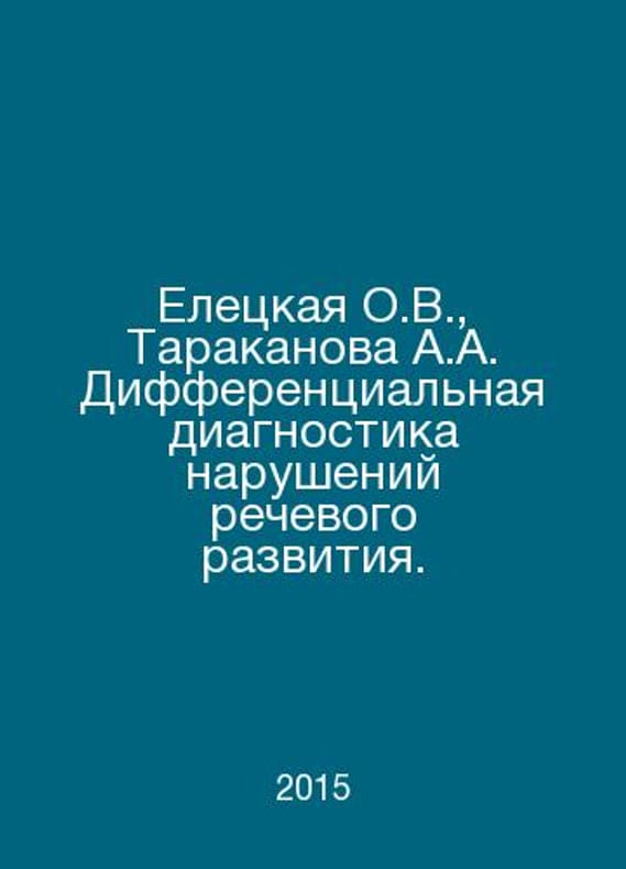 Yeletskaya O.V., Tarakanova A.A. Differential diagnosis of speech disorders. In Russian /Eletskaya O.V., Tarakanova A.A. Differentsialnaya diagnostika narusheniy rechevogo razvitiya. Teaching and Methodological Manual. Moscow, Forum, 2015.Contact us for details or to request photos of available books. Delivery of this book could take longer than normal due to additional handling time before shipping, and no rush delivery options are available. Please let us know if you have a specific date by which you need to receive your order.SKUalb2252c5e00f428b96