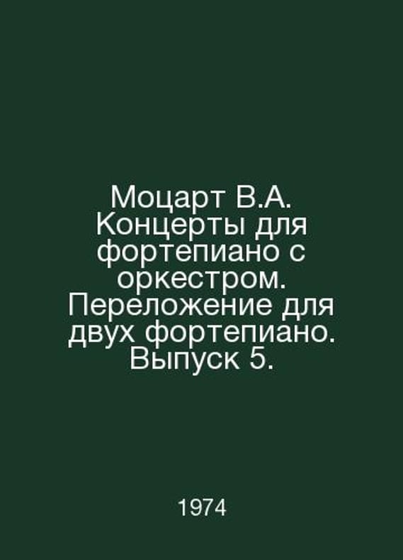 Mozart V.A. Piano Concerts with Orchestra. Arrangement for Two Pianos. Issue 5. In Russian /Motsart V.A. Kontserty dlya fortepiano s orkestrom. Perelozhenie dlya dvukh fortepiano. Vypusk 5. M. Music 1974. Contact us for details or to request photos of available books. Delivery of this book could take longer than normal due to additional handling time before shipping, and no rush delivery options are available. Please let us know if you have a specific date by which you need to receive your order.SKUalb23242d68e2f559f6