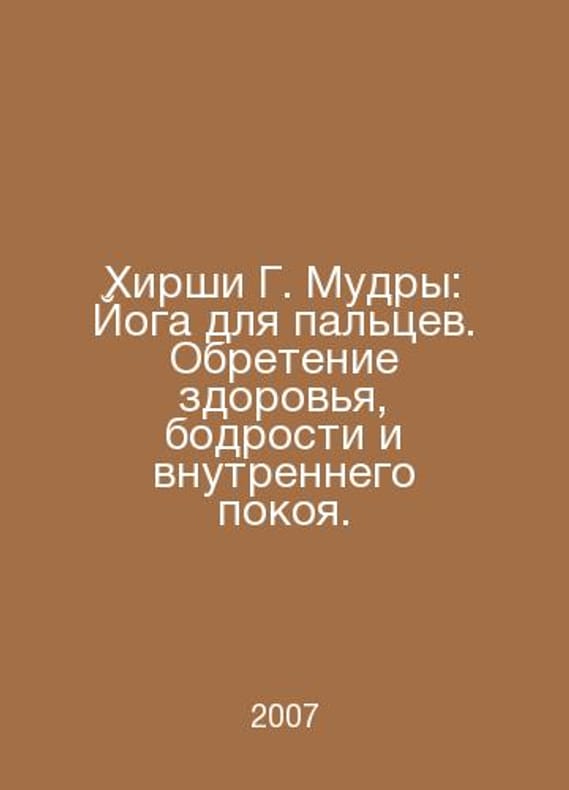 Hirshi G. Mudra: Finger Yoga: Finding Health, Vivacity, and Inner Peace. In Russian /Khirshi G. Mudry: Yoga dlya paltsev. Obretenie zdorovya, bodrosti i vnutrennego pokoya. Translation by V. Belonozhko. Popular Scientific Edition. M. AST. Astrel. 2007. Contact us for details or to request photos of available books. Delivery of this book could take longer than normal due to additional handling time before shipping, and no rush delivery options are available. Please let us know if you have a specific date by which you need to receive your order. SKUalb26e3ca8a802d3464