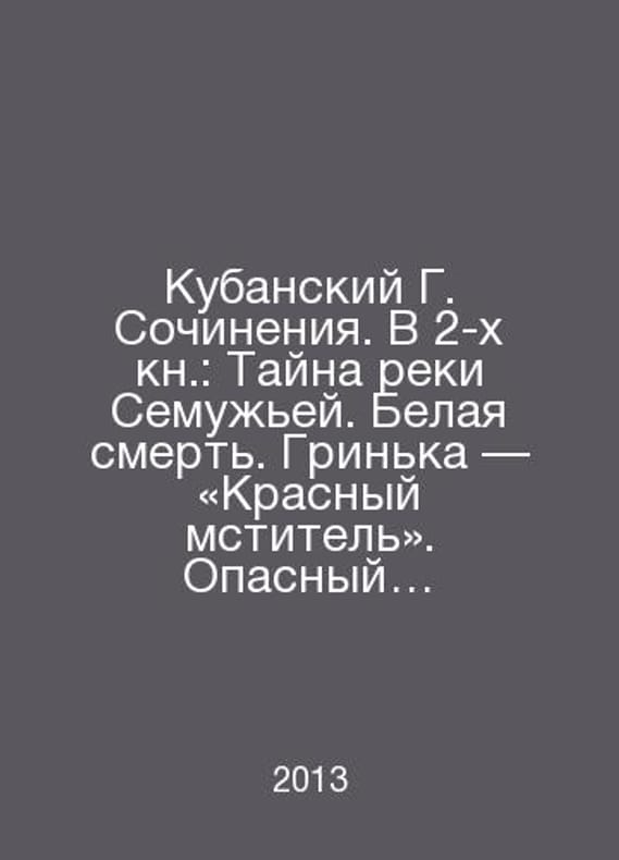 Kubansky G. Works. In Book 2: The Mystery of the Seven River. White Death. Grinka. Red Avenger. Dangerous Witness. I will still come. More precious than life. Diamond. In Russian /Kubanskiy G. Sochineniya. V 2-kh kn.: Tayna reki Semuzhey. Belaya smert. Grinka ´Krasnyy mstitel. Opasnyy svidetel. Ya eshche priedu. Dorozhe zhizni. Almaz. Library of Adventure and Science Fiction (sequel) Moscow Prestige Book 2013.Contact us for details or to request photos of available books. Delivery of this book could take longer than normal due to additional handling time before shipping, and no rush delivery options are available. Please let us know if you have a specific date by which you need to receive your order.SKUalb2881dc75b828d467
