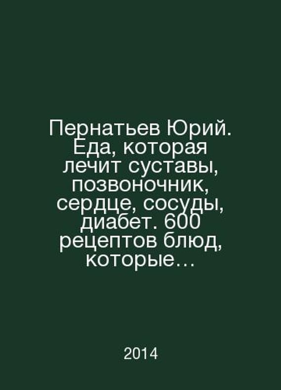 Feathered Yuri. Food that treats joints, spine, heart, blood vessels, diabetes. 600 recipes to help you recover In Russian /Pernatev Yuriy. Eda, kotoraya lechit sustavy, pozvonochnik, serdtse, sosudy, diabet. 600 retseptov blyud, kotorye pomogut vam vyzdorovet Kharkiv, Belgorod Book Club, Family Leisure Club 2014..Contact us for details or to request photos of available books. Delivery of this book could take longer than normal due to additional handling time before shipping, and no rush delivery options are available. Please let us know if you have a specific date by which you need to receive your order. SKUalb2ab15802f28dc218