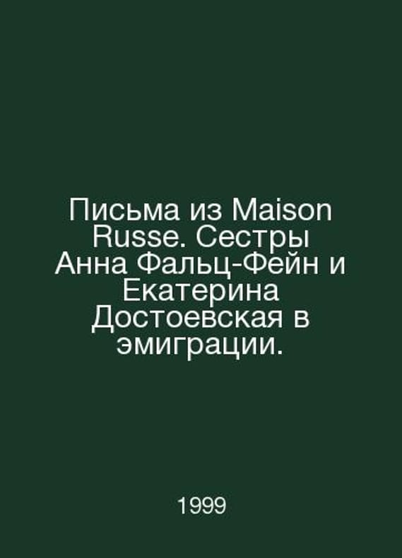 Letters from Maison Russe. (Sisters Anna Falz-Fein and Catherine Dostoyevsky in exile). In Russian (ask us if in doubt)/Pisma iz Maison Russe. (Sestry Anna Falts-Feyn i Ekaterina Dostoevskaya v emigratsii).. Short description: In Russian (ask us if in doubt).Letters from Maison Russe. (Sisters Anna Falz-Fein and Catherine Dostoyevsky in exile). We have thousands of titles and often several copies of each title may be available. Please feel free to contact us for a detailed description of the copies available. SKUalb67514165f1da87b1