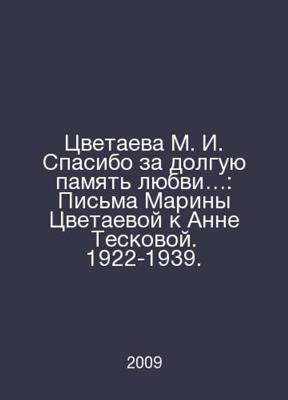 Tsvetaeva M. I. Thank you for the long memory of love: Letters from Marina Tsvetaeva to Anna Teskova. 1922-1939. In Russian /Tsvetaeva M. I. Spasibo za dolguyu pamyat lyubvi: Pisma Mariny Tsvetaevoy k Anne Teskovoy. 1922-1939. M. Russian way. 2009 year.Contact us for details or to request photos of available books. Delivery of this book could take longer than normal due to additional handling time before shipping, and no rush delivery options are available. Please let us know if you have a specific date by which you need to receive your order.SKUalb2e030a1b8a8b43e2