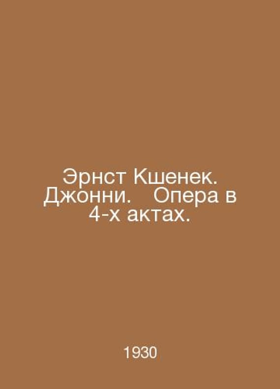 Ernst Ksenek. Johnny. Opera in 4 Acts. In Russian /Ernst Kshenek. Dzhonni.†Opera v 4-kh aktakh. Music by Ernst Ksenek. Libretto translated by Mih. Halperin (in collaboration with Evg. Gerken). Moscow: TEAKINO-PETE. 1930. Contact us for details or to request photos of available books. Delivery of this book could take longer than normal due to additional handling time before shipping, and no rush delivery options are available. Please let us know if you have a specific date by which you need to receive your order.SKUalb2ede01c2177d33fe