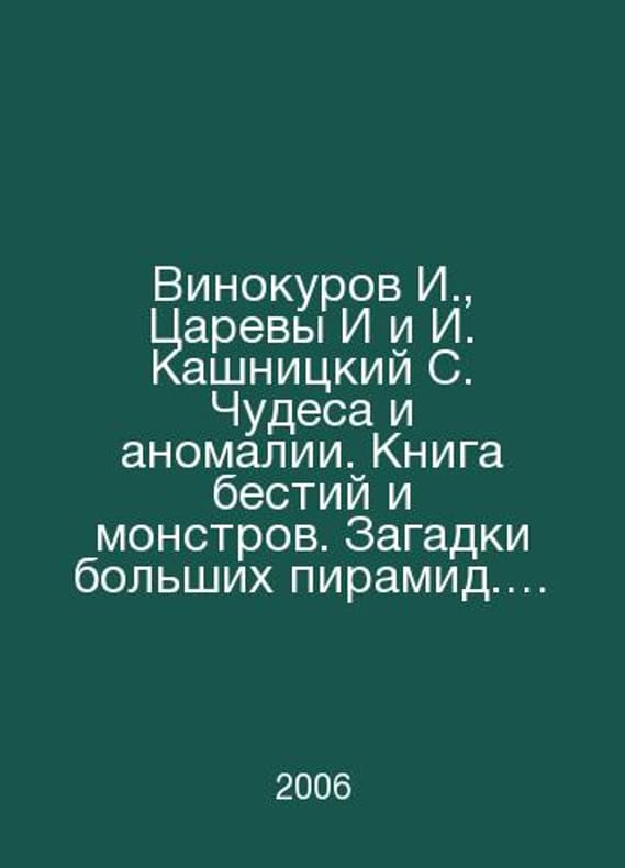 Vinokurov I., Tsarev I., and Kashnitsky S. Miracles and Anomalies. Book of Bestia and Monsters. Puzzles of the Great Pyramids. Two Faces of the Unknown. Miracle-People. Invisible Phantoms. Set of 6 books. In Russian /Vinokurov I., Tsarevy I i I. Kashnitskiy S. Chudesa i anomalii. Kniga bestiy i monstrov. Zagadki bolshikh piramid. Dva lika nevedomogo. Chudo-lyudi. Nevidimye fantomy. Komplekt iz 6-ti knig. Kunstkammer of Secret Knowledge. 6 books. Olma-Press. 2006. Contact us for details or to request photos of available books. Delivery of this book could take longer than normal due to additional handling time before shipping, and no rush delivery options are available. Please let us know if you have a specific date by which you need to receive your order. SKUalb304fbd4b80621ba2