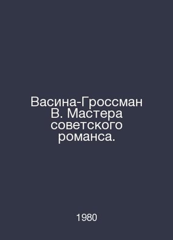 Vasina Grossman V. Masters of Soviet Romance. In Russian /Vasina-Grossman V. Mastera sovetskogo romansa. 2nd edition, revised, supplemented. M. Music 1980. Contact us for details or to request photos of available books. Delivery of this book could take longer than normal due to additional handling time before shipping, and no rush delivery options are available. Please let us know if you have a specific date by which you need to receive your order.SKUalb328aeb2ecb6f6824