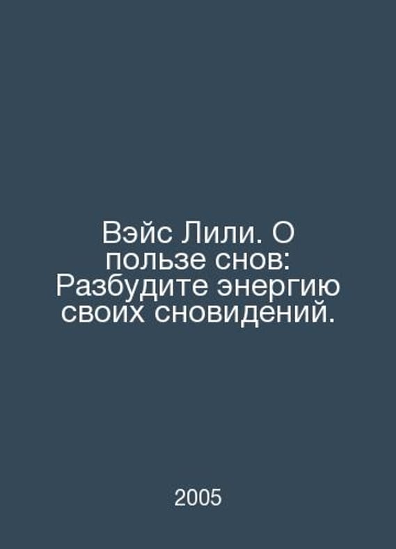 Vace Lily. On the benefits of dreams: Wake up the energy of your dreams. In Russian /Veys Lili. O polze snov: Razbudite energiyu svoikh snovideniy. Series: The Masters Way. Rostov-on-Don: Phoenix 2005. Contact us for details or to request photos of available books. Delivery of this book could take longer than normal due to additional handling time before shipping, and no rush delivery options are available. Please let us know if you have a specific date by which you need to receive your order. SKUalb33886c3dc28c026a
