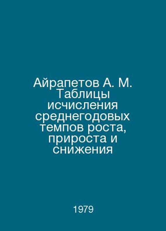 Ayrapetov A. M. Tables for calculating average annual rates of growth, growth and decline In Russian /Ayrapetov A. M. Tablitsy ischisleniya srednegodovykh tempov rosta, prirosta i snizheniya Edition 4 M Statistics 1979.Contact us for details or to request photos of available books. Delivery of this book could take longer than normal due to additional handling time before shipping, and no rush delivery options are available. Please let us know if you have a specific date by which you need to receive your order.SKUalb34e0ced41fd2f914