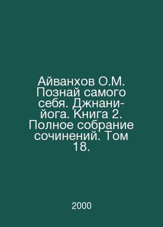 Ivanhov O.M. Know yourself. Jnani Yoga. Book 2. Complete collection of essays. Volume 18. In Russian /Ayvankhov O.M. Poznay samogo sebya. Dzhnani-yoga. Kniga 2. Polnoe sobranie sochineniy. Tom 18. The Complete Collection of Works. Volume 18. Moscow, Prosvyeta. 2000. Contact us for details or to request photos of available books. Delivery of this book could take longer than normal due to additional handling time before shipping, and no rush delivery options are available. Please let us know if you have a specific date by which you need to receive your order. SKUalb350546e18d4972d9