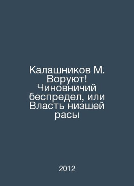 Kalashnikov M. Steals Official outrage or the Power of an inferior race In Russian /Kalashnikov M. Voruyut Chinovnichiy bespredel, ili Vlast nizshey rasy M 2012.Contact us for details or to request photos of available books. Delivery of this book could take longer than normal due to additional handling time before shipping, and no rush delivery options are available. Please let us know if you have a specific date by which you need to receive your order.SKUalb3558df2eed7c1e1e