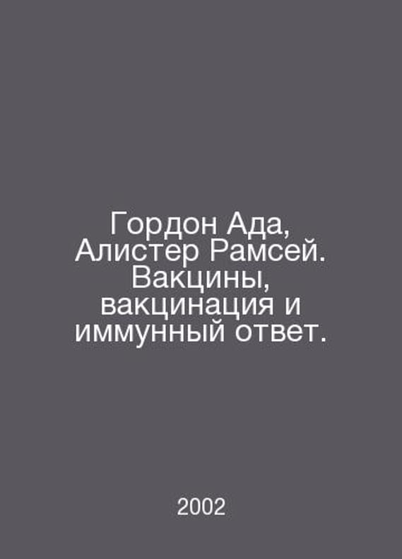 Gordon Ada, Alister Ramsay, Vaccines, Vaccines, and Immune Response. In Russian /Gordon Ada, Alister Ramsey. Vaktsiny, vaktsinatsiya i immunnyy otvet. Translated from English by Professor A.N. Cheredeev. M. Medicine, 2002.. Contact us for details or to request photos of available books. SKUalb35938c2d7261da32.