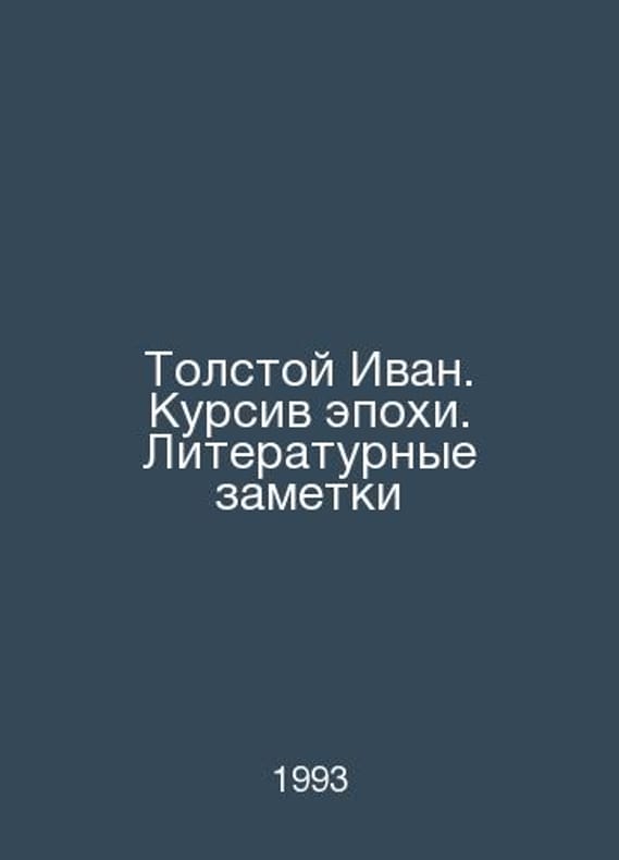 Tolstoy Ivan. The italics of the epoch. Literary notes In Russian /Tolstoy Ivan. Kursiv epokhi. Literaturnye zametki St. Petersburg Edition of the Pushkin Foundation 1993. Contact us for details or to request photos of available books. Delivery of this book could take longer than normal due to additional handling time before shipping, and no rush delivery options are available. Please let us know if you have a specific date by which you need to receive your order. SKUalb36788c4bd9af9fc7