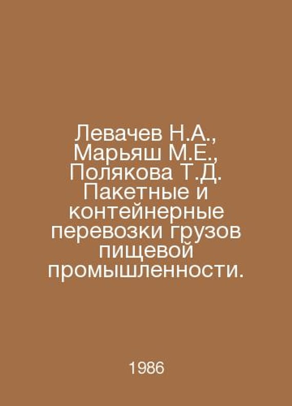 Levachev N.A., Maryash M.E., Polyakova T.D. Packaging and container transport of foodstuffs. In Russian /Levachev N.A., Maryash M.E., Polyakova T.D. Paketnye i konteynernye perevozki gruzov pishchevoy promyshlennosti. M. Agropromyzdat 1986.. Contact us for details or to request photos of available books. SKUalb3810f098a7ba68ae.