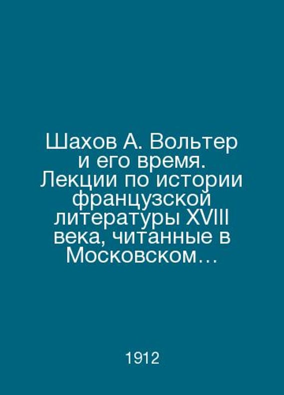 Shahov A. Voltaire and his time. Lectures on the history of eighteenth-century French literature at Moscow University. In Russian /Shakhov A. Volter i ego vremya. Lektsii po istorii frantsuzskoy literatury XVIII veka, chitannye v Moskovskom universitete. Second edition. St. Petersburg: Trenke and Fusno Printing House. 1912. Contact us for details or to request photos of available books. Delivery of this book could take longer than normal due to additional handling time before shipping, and no rush delivery options are available. Please let us know if you have a specific date by which you need to receive your order. SKUalb397507f3c7bb5904