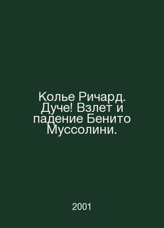 Richard Duce Collier The Rise and Fall of Benito Mussolini. In Russian /Kole Richard. Duche Vzlet i padenie Benito Mussolini. M Centropolygraph. 2001.Contact us for details or to request photos of available books. Delivery of this book could take longer than normal due to additional handling time before shipping, and no rush delivery options are available. Please let us know if you have a specific date by which you need to receive your order.SKUalb3b50a7497699be49
