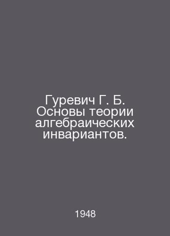 Gurevich G. B. Fundamentals of algebraic invariant theory. In Russian /Gurevich G. B. Osnovy teorii algebraicheskikh invariantov. Moscow-Leningrad OGIZ 1948.Contact us for details or to request photos of available books. Delivery of this book could take longer than normal due to additional handling time before shipping, and no rush delivery options are available. Please let us know if you have a specific date by which you need to receive your order.SKUalb3bf502476830f575