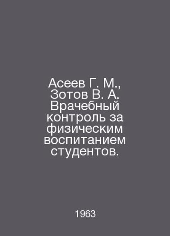 Aseev G. M., Zotov V. A. Physical supervision of students physical education. In Russian /Aseev G. M., Zotov V. A. Vrachebnyy kontrol za fizicheskim vospitaniem studentov. Moscow Medgiz 1963.Contact us for details or to request photos of available books. Delivery of this book could take longer than normal due to additional handling time before shipping, and no rush delivery options are available. Please let us know if you have a specific date by which you need to receive your order.SKUalb3c505d4d715d6046