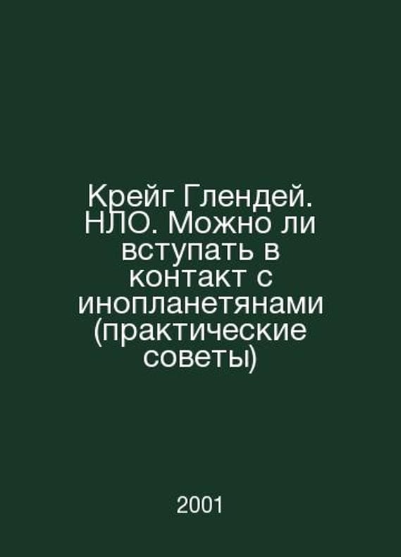 Craig Glenday. UFO. Can you make contact with aliens (practical advice) In Russian /Kreyg Glendey. NLO. Mozhno li vstupat v kontakt s inoplanetyanami (prakticheskie sovety) M. BMM AO 2001. Contact us for details or to request photos of available books. Delivery of this book could take longer than normal due to additional handling time before shipping, and no rush delivery options are available. Please let us know if you have a specific date by which you need to receive your order. SKUalb3d5e0d0299f10a55