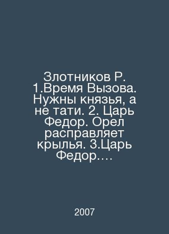 2. Tsar Fedor. The eagle spreads its wings. 3. Tsar Fedor. The eagle flies up. In Russian /Zlotnikov R. 1.Vremya Vyzova. Nuzhny knyazya, a ne tati. 2. Tsar Fedor. Orel raspravlyaet krylya. 3.Tsar Fedor. Orel vzmyvaet vvys. M. Alfa-book. 2007-2010. Contact us for details or to request photos of available books. Delivery of this book could take longer than normal due to additional handling time before shipping, and no rush delivery options are available. Please let us know if you have a specific date by which you need to receive your order.SKUalb41b76a3d053cadf6