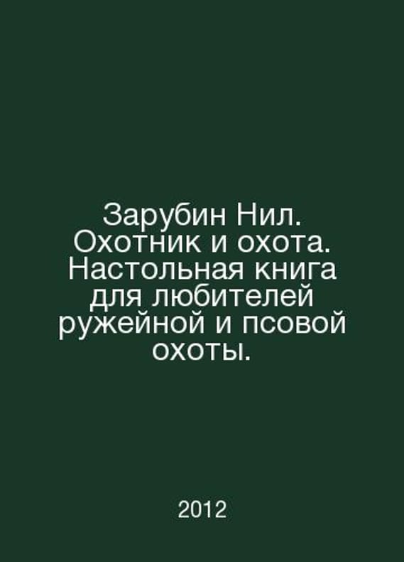 Zarubin Nile. A hunter and hunter. A handbook for lovers of gun and dog hunting. In Russian /Zarubin Nil. Okhotnik i okhota. Nastolnaya kniga dlya lyubiteley ruzheynoy i psovoy okhoty. M. Publishing House Librokom. 2012.Contact us for details or to request photos of available books. Delivery of this book could take longer than normal due to additional handling time before shipping, and no rush delivery options are available. Please let us know if you have a specific date by which you need to receive your order.SKUalb42d820d9bf31d214