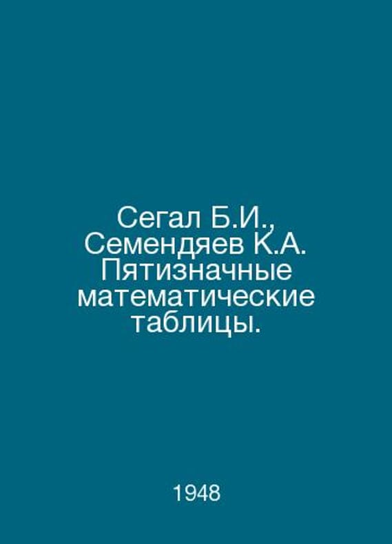 Segal B.I., Semendyaev K.A. Five-digit mathematical tables. In Russian /Segal B.I., Semendyaev K.A. Pyatiznachnye matematicheskie tablitsy. M. Publishing House of the USSR Academy of Sciences 1948.Contact us for details or to request photos of available books. Delivery of this book could take longer than normal due to additional handling time before shipping, and no rush delivery options are available. Please let us know if you have a specific date by which you need to receive your order.SKUalb4595e0e57f83d541