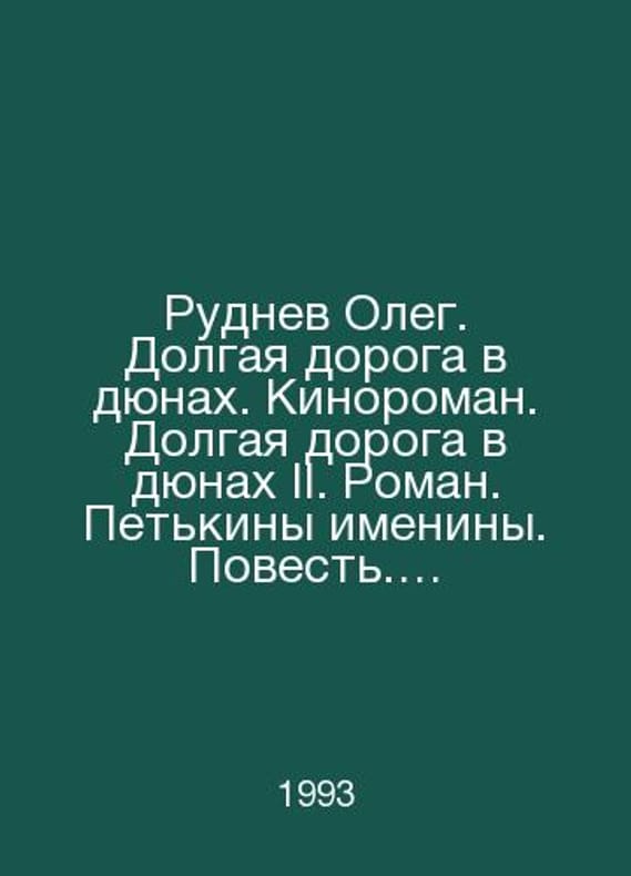 Oleg Rudnev. A Long Road in the Dunes. A Film Novel. A Long Road in the Dunes II. A Novel. Petkins Birthdays. A Story. Stories. In Russian /Rudnev Oleg. Dolgaya doroga v dyunakh. Kinoroman. Dolgaya doroga v dyunakh II. Roman. Petkiny imeniny. Povest. Rasskazy. M Drofa 1993.. Contact us for details or to request photos of available books. SKUalb45bba1c5d801376e.
