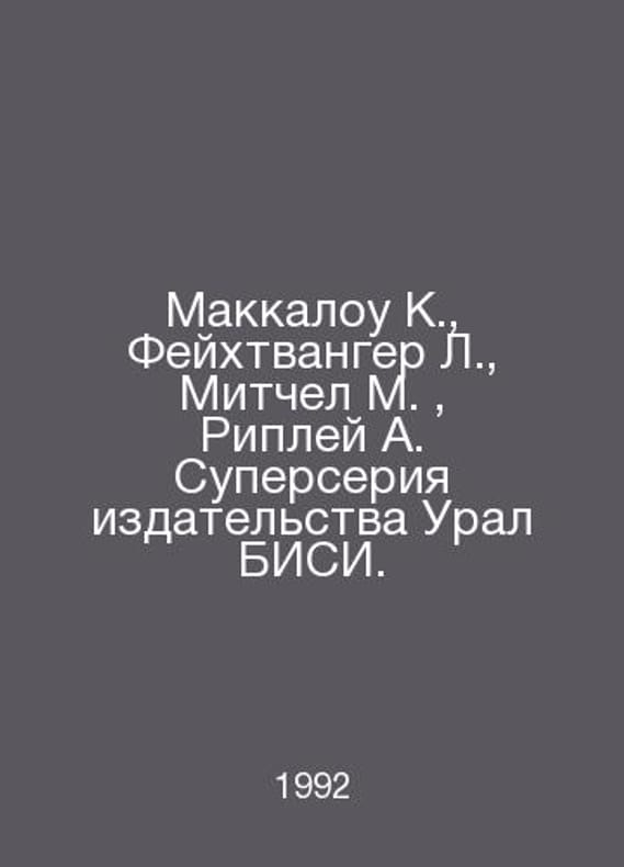 Makkalou K., Feichtwanger L., Mitchell M., Ripley A. The Ural BISI Superseries In Russian /Makkalou K., Feykhtvanger L., Mitchel M., Ripley A. Superseriya izdatelstva Ural BISI. Zhevsk Ural BISI 1992-1993. Contact us for details or to request photos of available books. Delivery of this book could take longer than normal due to additional handling time before shipping, and no rush delivery options are available. Please let us know if you have a specific date by which you need to receive your order. SKUalb4608f0e21a82205e