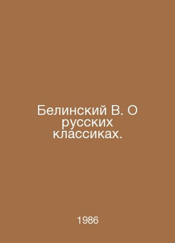 Belinsky V. On Russian Classics. In Russian /Belinskiy V. O russkikh klassikakh. M Wordlit. 1986. Contact us for details or to request photos of available books. Delivery of this book could take longer than normal due to additional handling time before shipping, and no rush delivery options are available. Please let us know if you have a specific date by which you need to receive your order. SKUalb461ed83a50f402ce