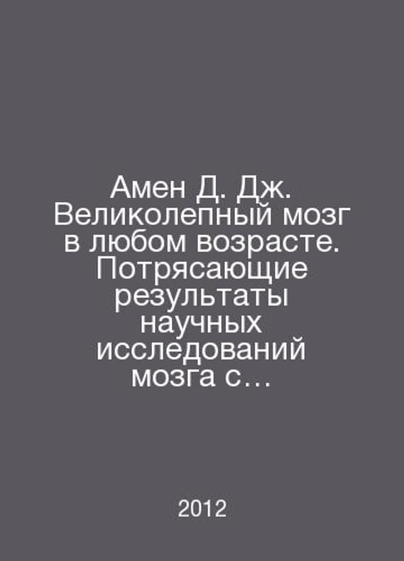 Amen D. J. Magnificent Brain at Any Age. Stunning results from brain research using CT scans. In Russian /Amen D. Dzh. Velikolepnyy mozg v lyubom vozraste. Potryasayushchie rezultaty nauchnykh issledovaniy mozga s primeneniem kompyuternoy tomografii. Series: Psychology. Brainstorming. M. Eksmo 2012. Contact us for details or to request photos of available books. Delivery of this book could take longer than normal due to additional handling time before shipping, and no rush delivery options are available. Please let us know if you have a specific date by which you need to receive your order.SKUalb4707ce98f803cc97