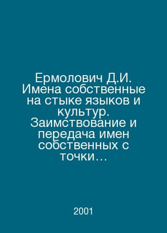 Ermolovich D.I. Our own names at the intersection of languages and cultures. Borrowing and transmitting our own names from the standpoint of linguistics and translation theory In Russian /Ermolovich D.I. Imena sobstvennye na styke yazykov i kultur. Zaimstvovanie i peredacha imen sobstvennykh s tochki zreniya lingvistiki i teorii perevoda Moscow: Publishing House of Perm University, 2001. Contact us for details or to request photos of available books. Delivery of this book could take longer than normal due to additional handling time before shipping, and no rush delivery options are available. Please let us know if you have a specific date by which you need to receive your order. SKUalb47259be6b1f483ea