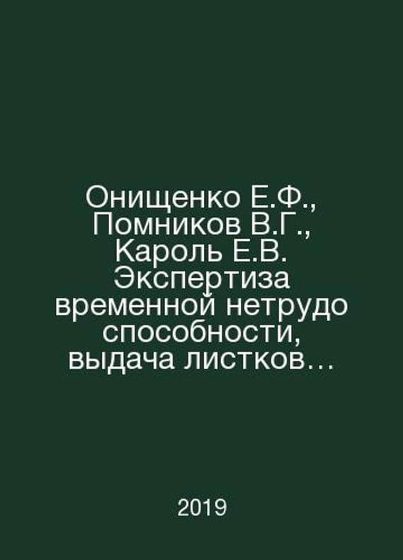 E.F. Onishchenko, V.G. Pomnikov, E.V. Karol Expertise of temporary disability, issuance of disability certificates, interdepartmental interaction of medical organizations with medical and social examination institutions in the Russian Federation In Russian /Onishchenko E.F., Pomnikov V.G., Karol E.V. Ekspertiza vremennoy netrudosposobnosti, vydacha listkov netrudosposobnosti, mezhvedomstvennoe vzaimodeystvie meditsinskikh organizatsiy s uchrezhdeniyami mediko-sotsialnoy ekspertizy v Rossiyskoy Federatsii. Rukovodstvo Series: M. Clinical Pathophysiology 2019.Contact us for details or to request photos of available books. Delivery of this book could take longer than normal due to additional handling time before shipping, and no rush delivery options are available. Please let us know if you have a specific date by which you need to receive your order.SKUalb490200135ded999f