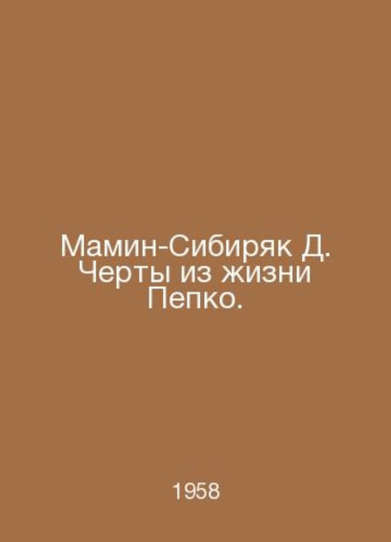 Mamin Sibiryak D. Features from Pepkos life. In Russian /Mamin-Sibiryak D. Cherty iz zhizni Pepko. M Worse. 1958.Contact us for details or to request photos of available books. Delivery of this book could take longer than normal due to additional handling time before shipping, and no rush delivery options are available. Please let us know if you have a specific date by which you need to receive your order.SKUalb499683bb1bad8507