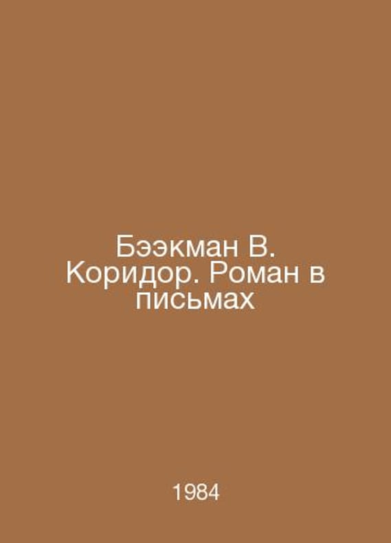 Backman V. Corridor. Roman in Letters In Russian /Beekman V. Koridor. Roman v pismakh Tallinn Eesti Raamat 1984.Contact us for details or to request photos of available books. Delivery of this book could take longer than normal due to additional handling time before shipping, and no rush delivery options are available. Please let us know if you have a specific date by which you need to receive your order.SKUalb4b2131e16f175b28