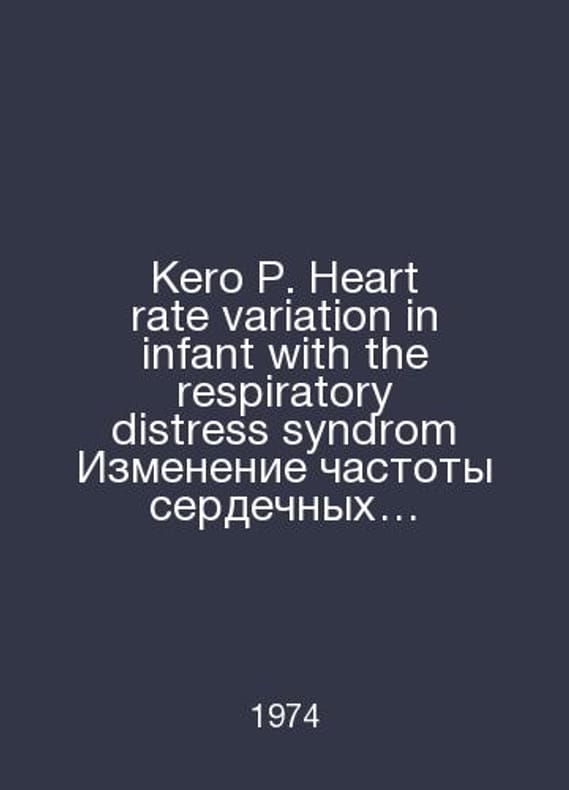 Kero Heart rate variation in infant with the respiratory distress syndrome Changing heart rate in an infant with respiratory distress syndrome. In English /Kero Heart rate variation in infant with the respiratory distress syndrom Izmenenie chastoty serdechnykh sokrashcheniy u mladentsa s respiratornym distress-sindromom. In English. Turku 1974.Contact us for details or to request photos of available books. Delivery of this book could take longer than normal due to additional handling time before shipping, and no rush delivery options are available. Please let us know if you have a specific date by which you need to receive your order.SKUalb4b68dccac8ab2536