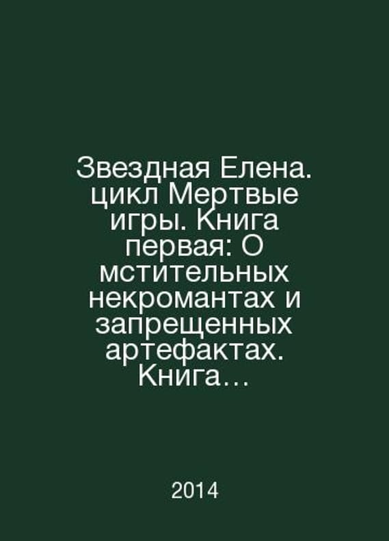 Star Eyes. Dead Games Cycle. Book One: On Vindictive Necromants and Prohibited Artifacts. Book Two: On Apostasy Magicians and Mysterious Rituals. In Russian /Zvezdnaya Elena. tsikl Mertvye igry. Kniga pervaya: O mstitelnykh nekromantakh i zapreshchennykh artefaktakh. Kniga vtoraya. O magakh-otstupnikakh i tainstvennykh ritualakh. Series: Witchcraft Worlds. M. Exmo 2014-2015. Contact us for details or to request photos of available books. Delivery of this book could take longer than normal due to additional handling time before shipping, and no rush delivery options are available. Please let us know if you have a specific date by which you need to receive your order.SKUalb4be41d213662c73e