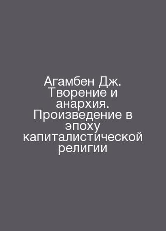 Agamben J. Creation and Anarchy: A Work in the Age of Capitalist Religion In Russian /Agamben Dzh. Tvorenie i anarkhiya. Proizvedenie v epokhu kapitalisticheskoy religii M.: Gilea 2021. 156s.Contact us for details or to request photos of available books. Delivery of this book could take longer than normal due to additional handling time before shipping, and no rush delivery options are available. Please let us know if you have a specific date by which you need to receive your order.SKUalb4c333a096e9f777e