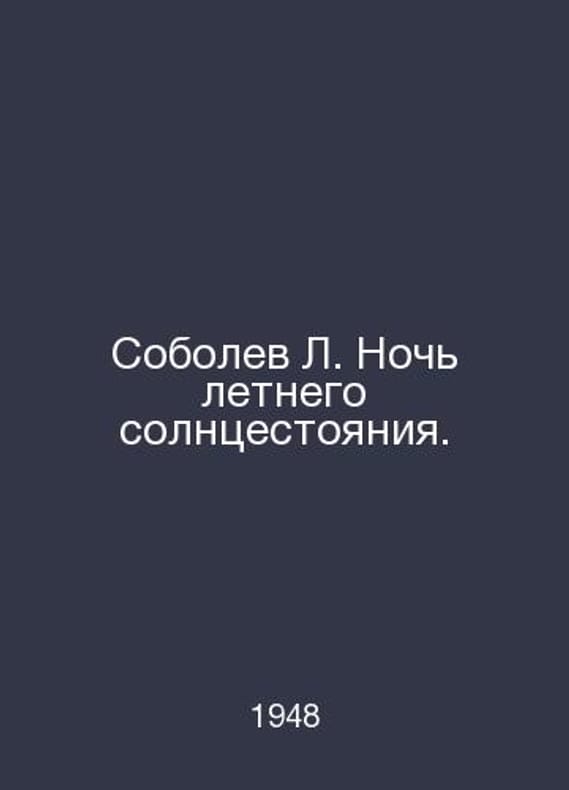 Sobolev L. Summer Solstice Night. In Russian /Sobolev L. Noch letnego solntsestoyaniya. M. Voenizdat. 1948.Contact us for details or to request photos of available books. Delivery of this book could take longer than normal due to additional handling time before shipping, and no rush delivery options are available. Please let us know if you have a specific date by which you need to receive your order.SKUalb4eabae3c2625bc2d