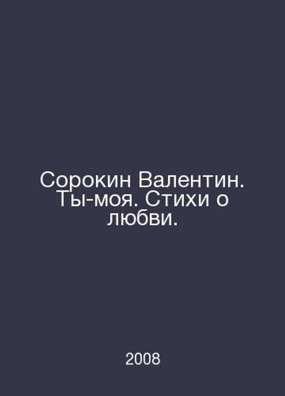 Sorokin Valentine. You are mine. Poems about love. In Russian /Sorokin Valentin. Ty-moya. Stikhi o lyubvi. Series: The Altar of Poetry. M. Ripoll classic 2008.Contact us for details or to request photos of available books. Delivery of this book could take longer than normal due to additional handling time before shipping, and no rush delivery options are available. Please let us know if you have a specific date by which you need to receive your order.SKUalb4ed25016b90f7751