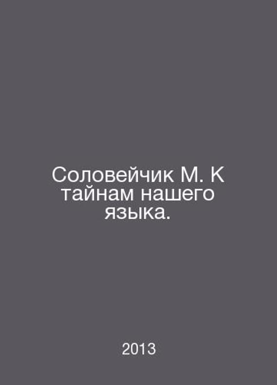 Nightingale M. To the Mysteries of Our Language. In Russian /Soloveychik M. K taynam nashego yazyka. Task book 1 to p.p. p. 3 ill11 Smolensk 2013 æ..Contact us for details or to request photos of available books. Delivery of this book could take longer than normal due to additional handling time before shipping, and no rush delivery options are available. Please let us know if you have a specific date by which you need to receive your order. SKUalb4f069d0ed71b75cb