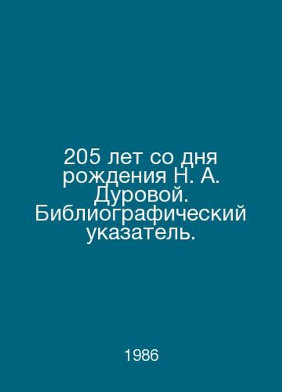 205 years since the birth of N. A. Durova. Bibliographic index. In Russian /205 let so dnya rozhdeniya N. A. Durovoy. Bibliograficheskiy ukazatel. In the title: Museum of History and Culture of the Middle Kamya Region. Ustinov year 1986.. Contact us for details or to request photos of available books. SKUalb4febc1baf49dba88.